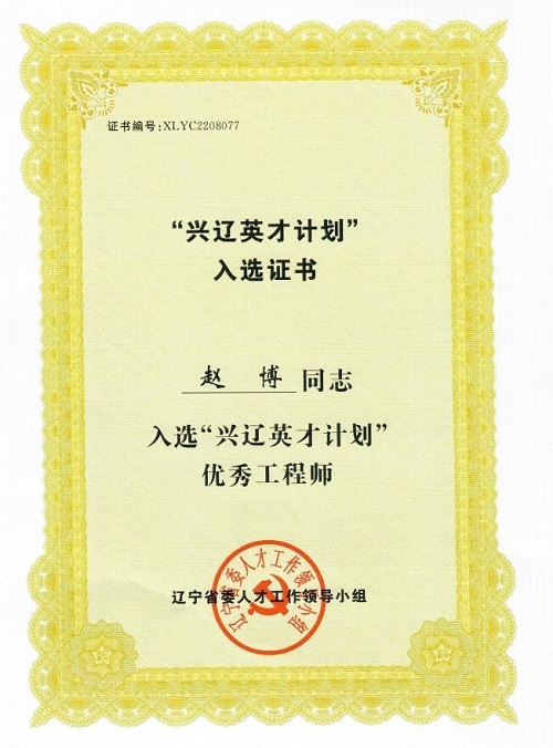 ????????遼寧紫竹高科裝備股份有限公司研究院院長趙博參加了“興遼英才計劃”優(yōu)秀工程師申報項目,近日,遼寧省委人才工作領(lǐng)導(dǎo)小組為其頒發(fā)“興遼英才計劃”優(yōu)秀工程師證書。